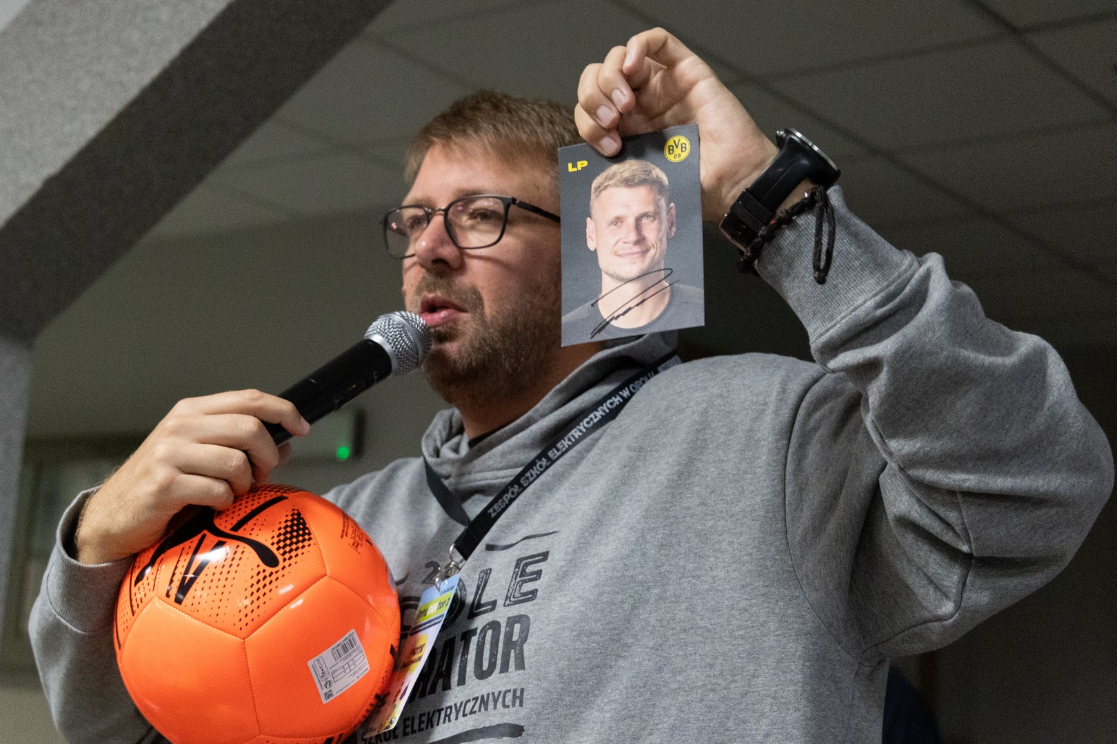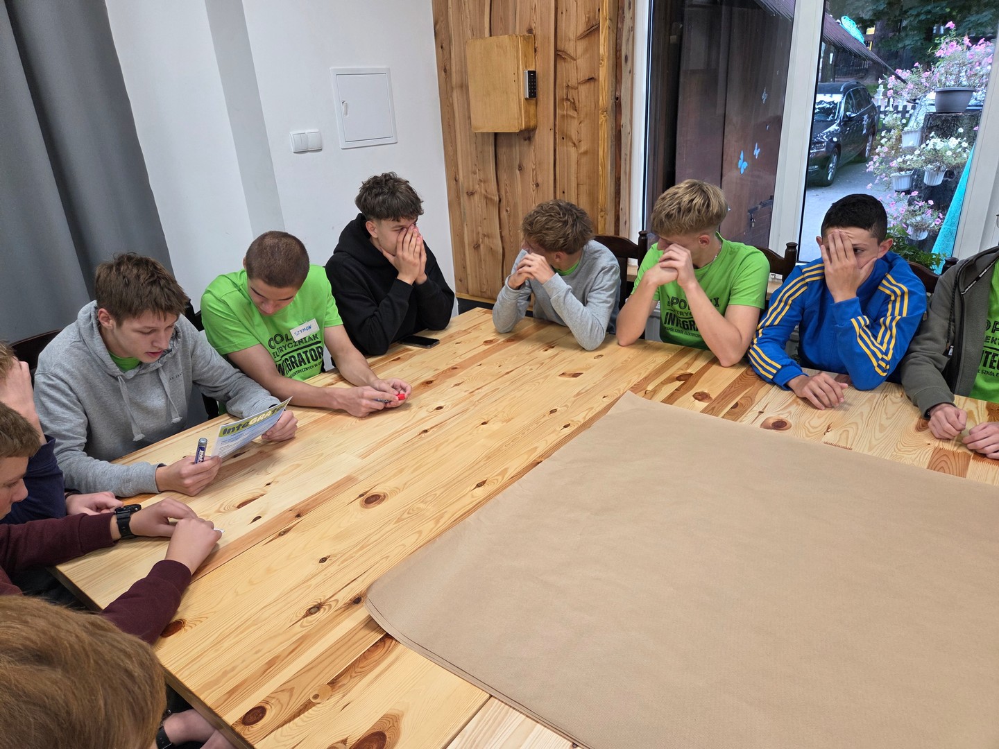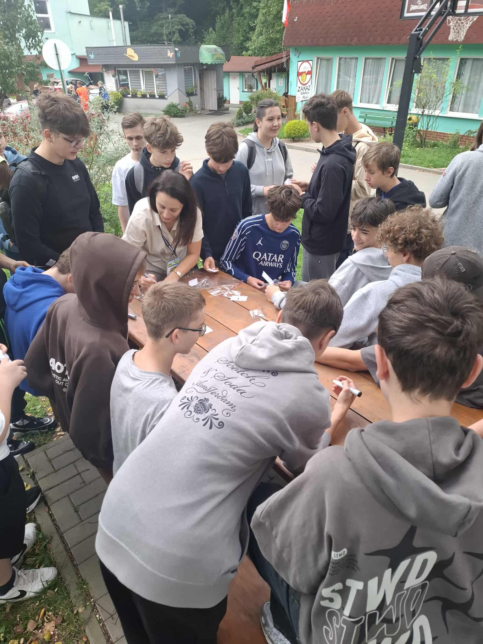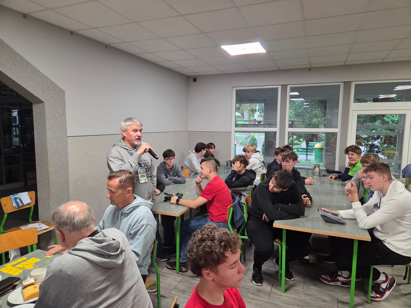 Drugi dzień rozpoczął się od spotkania z Dyrektorem Szkoły, który podkreślił wartość integracji i relacji między uczniami. Każda klasa przekazała na jego ręce przygotowany dzień wcześniej Kodeks Wartości. Jednym z najbardziej wyczekiwanych momentów było losowanie nagród, w tym prawdziwych rarytasów – piłki z autografem Łukasza Piszczka oraz piłki i zdjęć z podpisem Kuby Błaszczykowskiego. Emocji nie brakowało również podczas finałów sportowych, w których najlepsza okazała się klasa 1A, zwyciężając we wszystkich konkurencjach. Po obiedzie odbyła się niezwykła gra terenowa, która dostarczyła mnóstwo wrażeń. Uczniowie musieli zmierzyć się z różnorodnymi zadaniami – zagadkami logicznymi, łamigłówkami, zadaniami zręcznościowymi i wymagającymi spostrzegawczości, a także z próbami współpracy i kreatywności. Drużyny klasowe zbierały punkty, ale najważniejsza okazała się współpraca i dobra zabawa. Podczas gry terenowej uczniowie spotkali niezwykłą Osobę – pana Grzegorza Tomaszewskiego, jednego z więźniów obozu koncentracyjnego Auschwitz-Birkenau. W 1945 roku, mając zaledwie siedem lat, przeżył wojnę i wyzwolenie, stając się jednym z ostatnich żyjących świadków tamtych tragicznych wydarzeń. To spotkanie okazało się niezwykle cenną lekcją historii, której młodzież długo nie zapomni. Wieczorem odbył się pogodny wieczór – czas na planszówki, boisko i ping-pong.