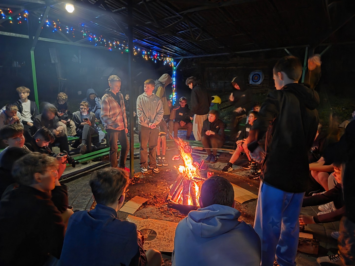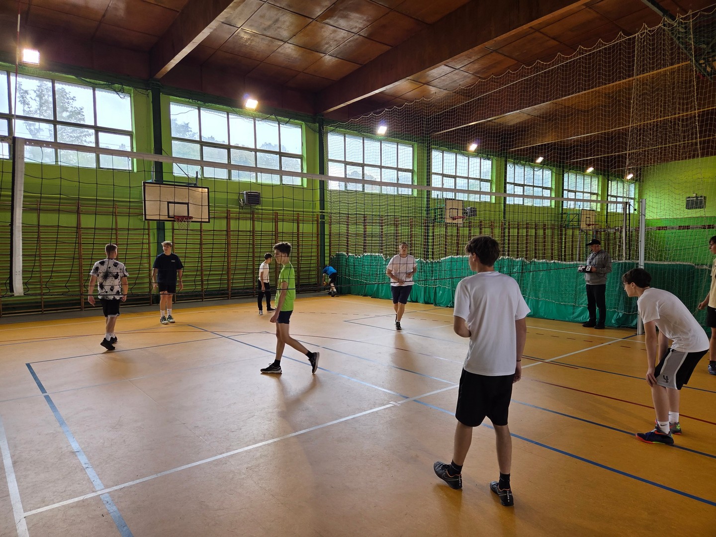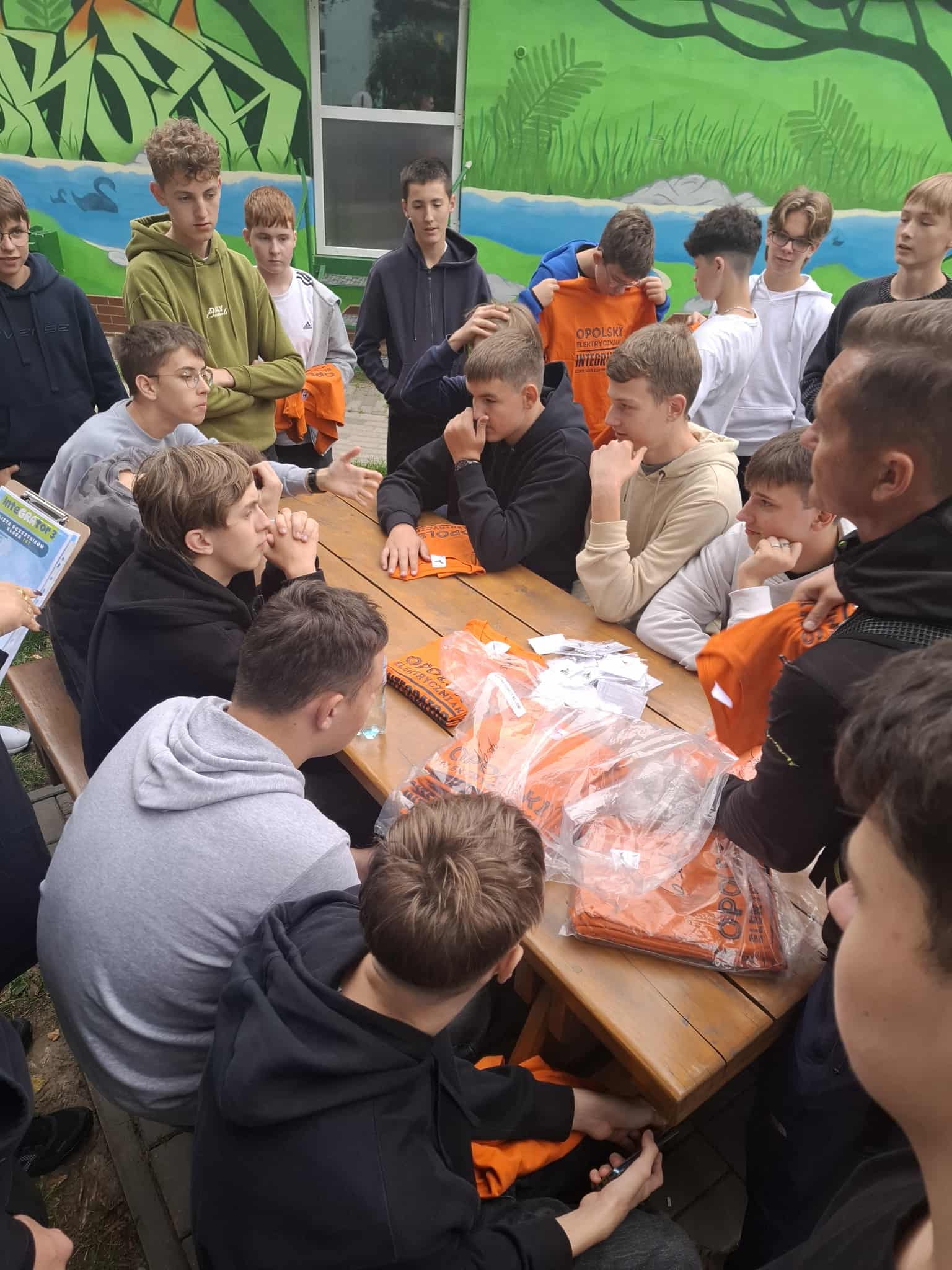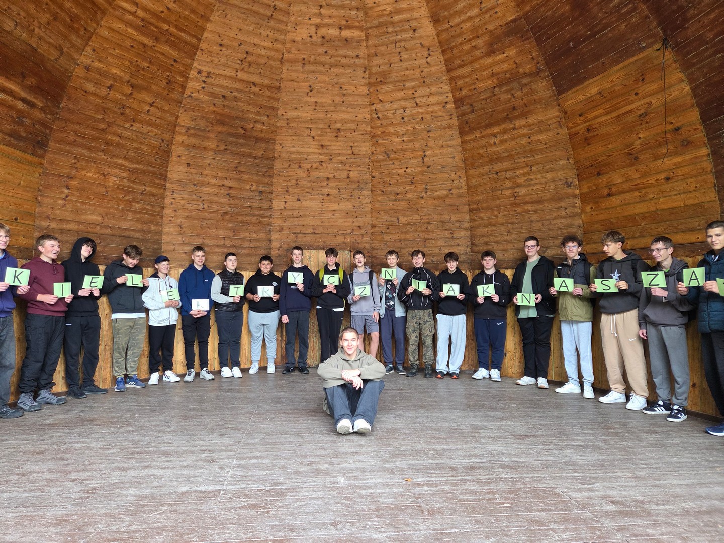 Zaraz po przyjeździe na uczniów czekało pierwsze zadanie integracyjne – związane z poznawaniem siebie nawzajem i swoich imion. Każdy uczestnik otrzymał identyfikator, a także pamiątkowy zestaw: koszulkę z logiem Integratora oraz worek sportowy. To był świetny początek wspólnej przygody, który od razu wprowadził atmosferę współpracy i otwartości. Na uczniów czekały także turnieje sportowe w siatkówkę, koszykówkę, piłkę nożną i szachy. Dawno nie było tak wyrównanych rozgrywek – poziom rywalizacji okazał się naprawdę wysoki, a emocje towarzyszące meczom były zupełnie prawdziwe. Dużym zainteresowaniem cieszyły się również warsztaty pierwszej pomocy przeprowadzone przez szkolną grupę ratowniczą. Po obiedzie przyszedł czas na sesję zdjęciową – uczniowie w nowych koszulkach stworzyli kolorową, pełną energii ekipę. Następnie wspólnie z wychowawcami przygotowali Kodeksy Deklaracji Wartości, które będą im towarzyszyć w kolejnych latach nauki. Wieczór zakończył się przy ognisku – w atmosferze rozmów, śmiechu i budowania relacji.