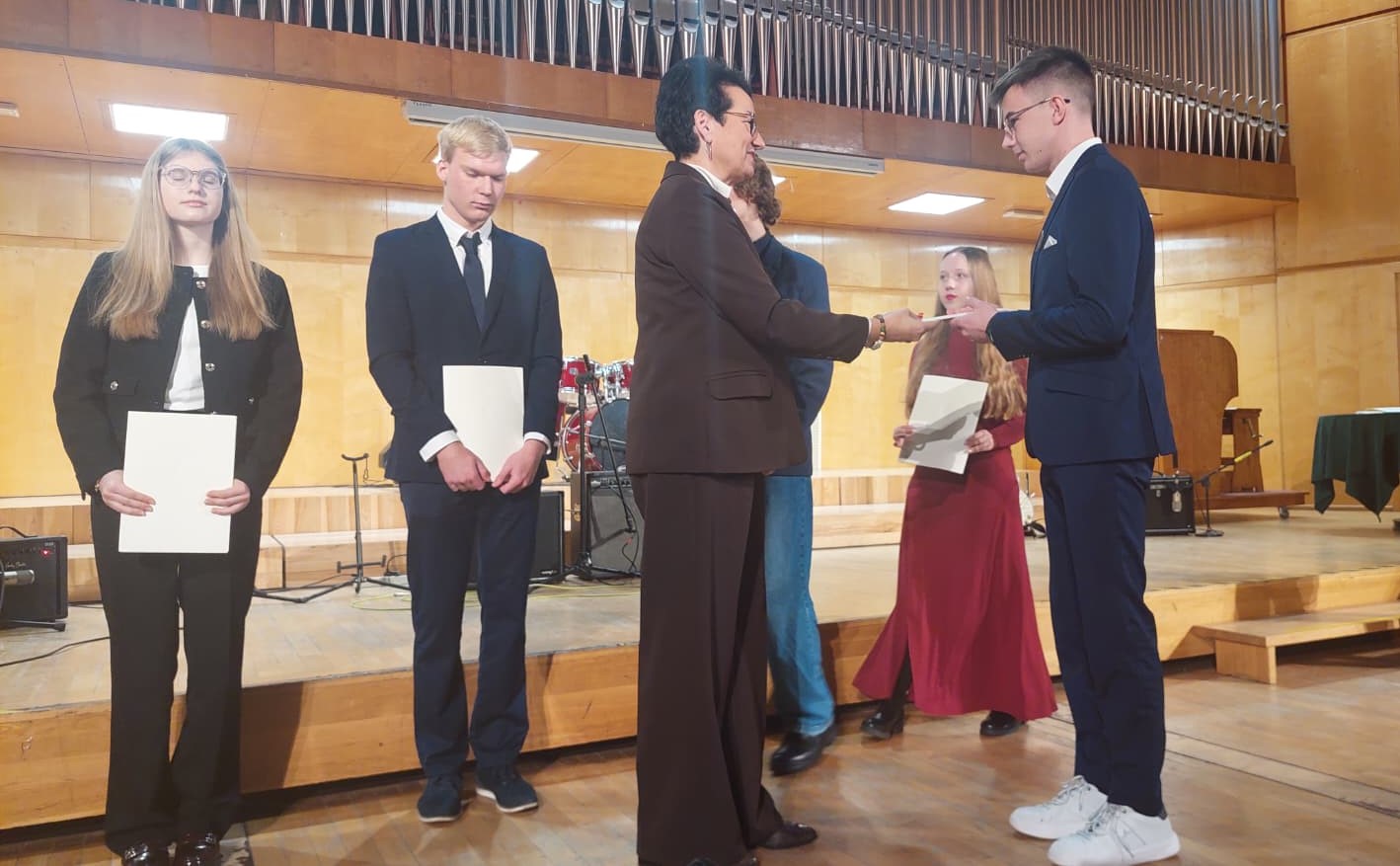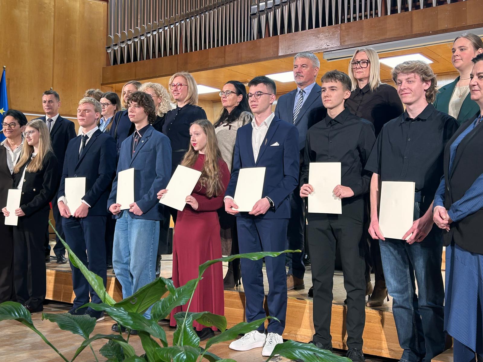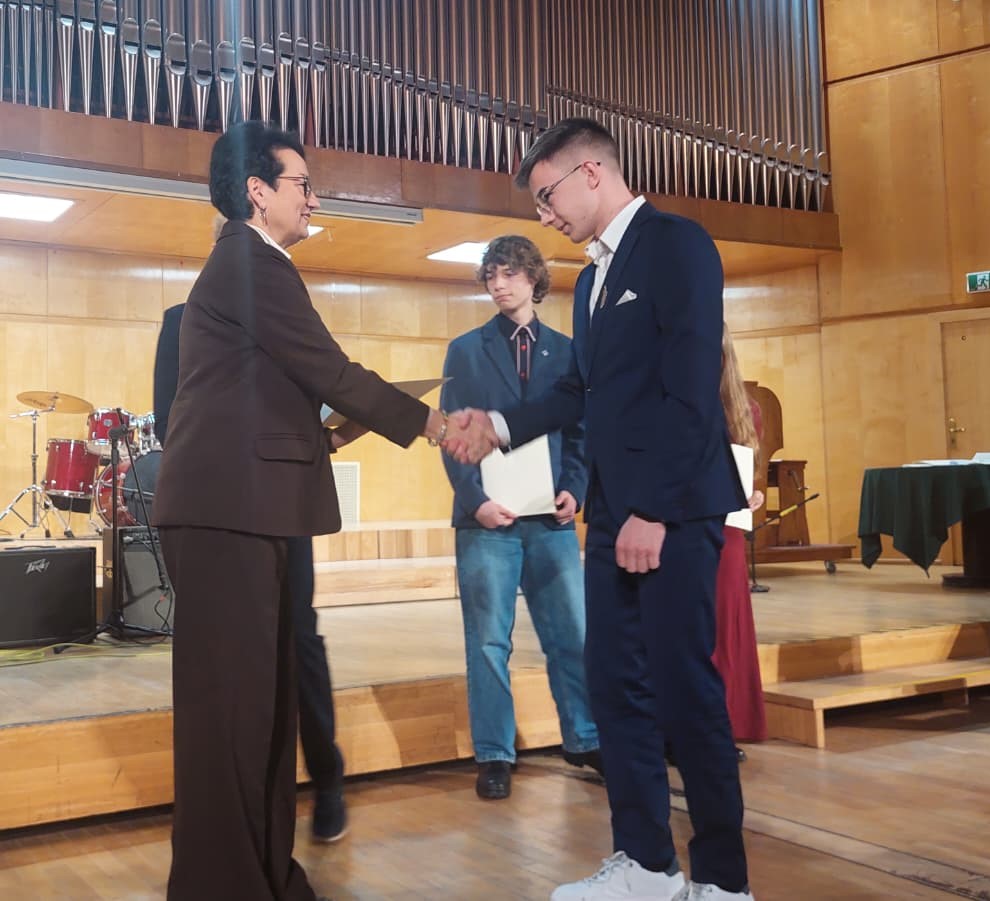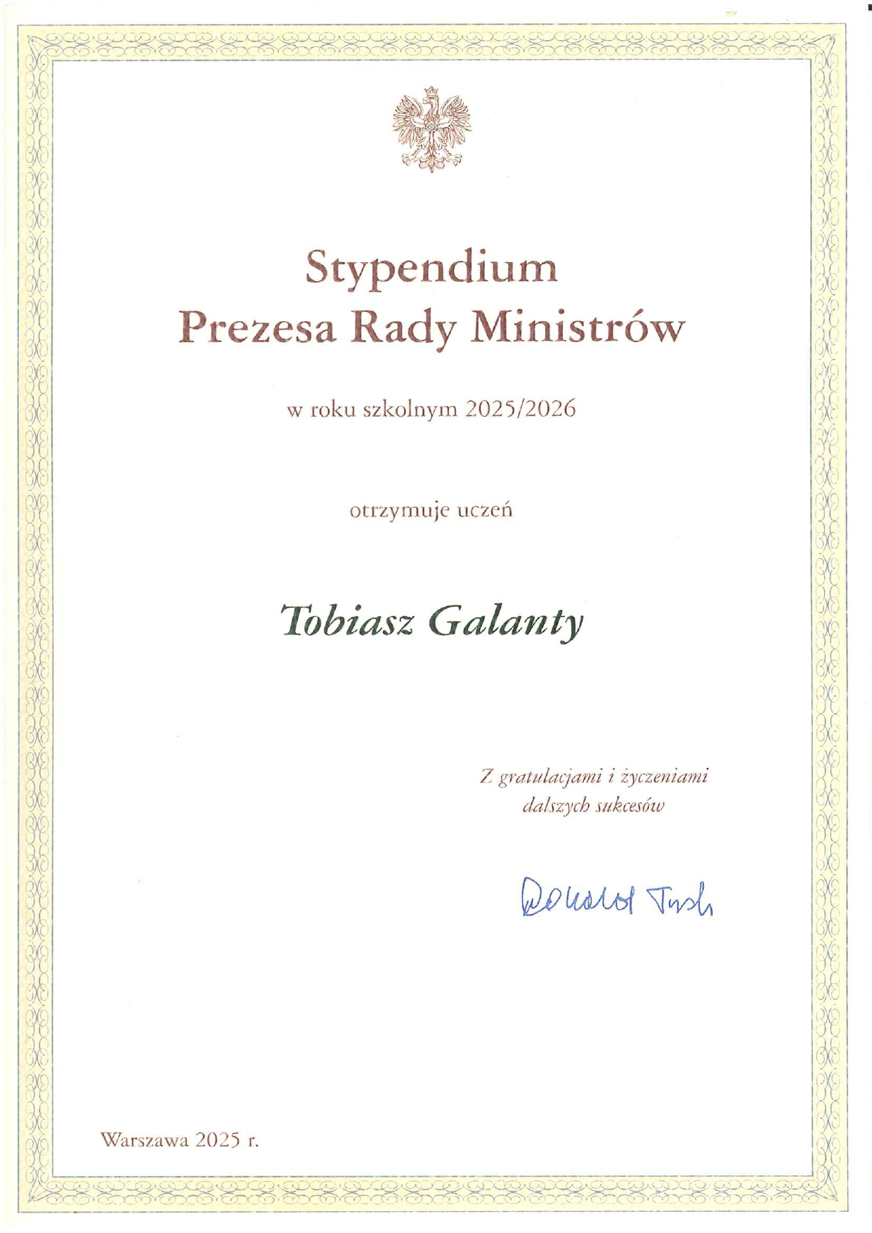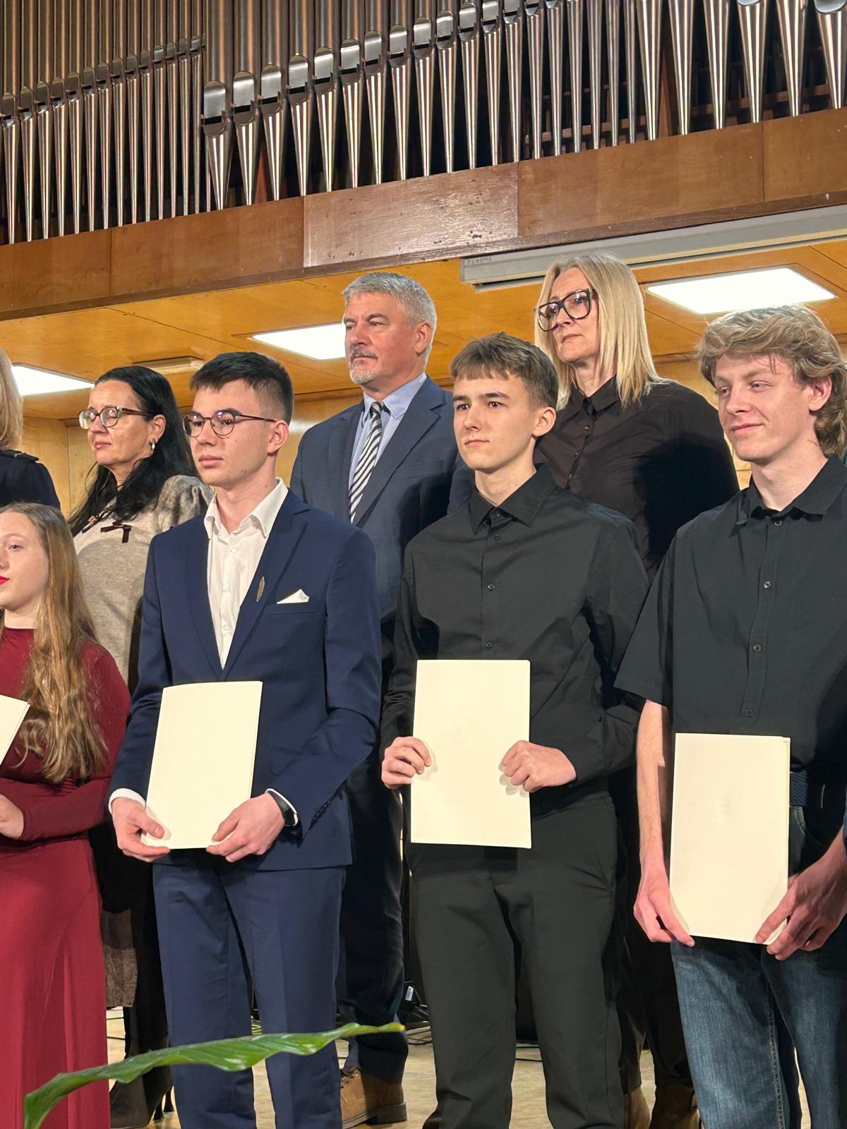Tobiasz Galanty, uczeń trzeciej klasy technikum został tegorocznym laureatem stypendium Prezesa Rady Ministrów. Uroczystość odbyła się 3 grudnia w Państwowej Szkole Muzycznej I i II stopnia w Opolu. Przypomnijmy, że Tobiasz jest tegorocznym laureatem Olimpiady Elektroników i Mechatroników ELEKTROMECHATRON.