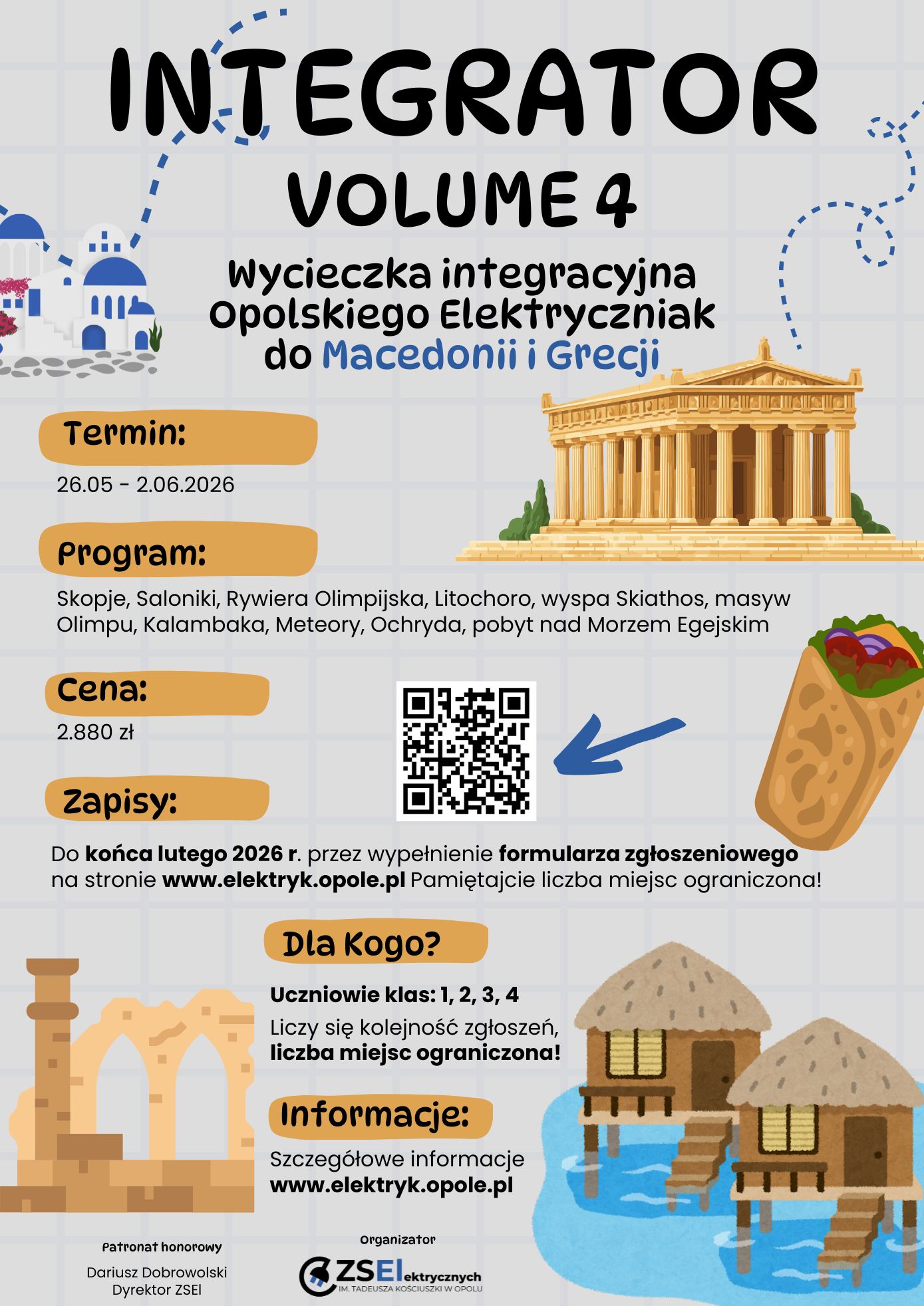 Po zeszłorocznym, pełnym wrażeń wyjeździe integracyjnym do Włoch mamy dla Was kolejną propozycję, obok której trudno przejść obojętnie – inteGRAtor 4!Po zeszłorocznym, pełnym wrażeń wyjeździe integracyjnym do Włoch mamy dla Was kolejną propozycję, obok której trudno przejść obojętnie – inteGRAtor 4!Zapraszamy wszystkich uczniów Opolskiego Elektryczniaka na tegoroczny wyjazd integracyjny – tym razem ruszamy na południe Europy, do Macedonii i Grecji.To będzie czas wspólnej drogi, integracji, poznawania nowych kultur, historii i pięknych miejsc, ale też zwykłego bycia razem – rozmów, radości i budowania relacji i wszystko w fabule inteGRAtora.Termin wyjazdu został dobrany tak, aby nie kolidował ani z egzaminami maturalnymi, ani z egzaminami zawodowymi, dlatego każdy może spokojnie zaplanować udział bez stresu.Jeśli chcesz przeżyć coś więcej niż zwykłą wycieczkę, poznać nowych ludzi, zobaczyć świat i stworzyć wspomnienia, które zostaną na lata – ten wyjazd jest właśnie dla Ciebie