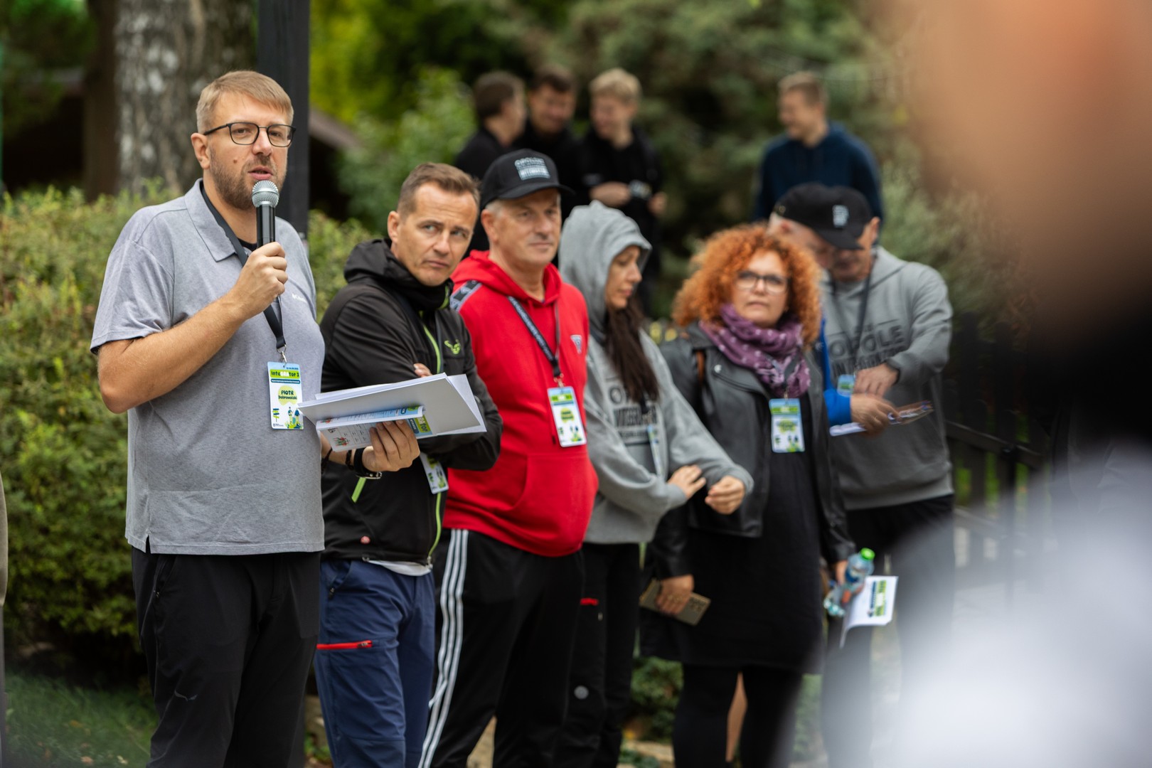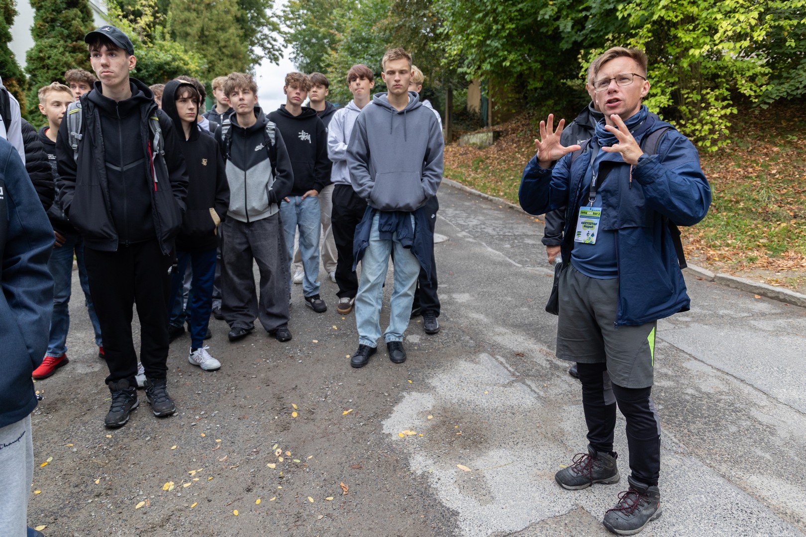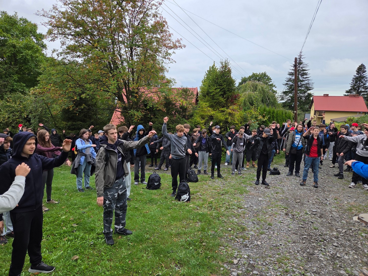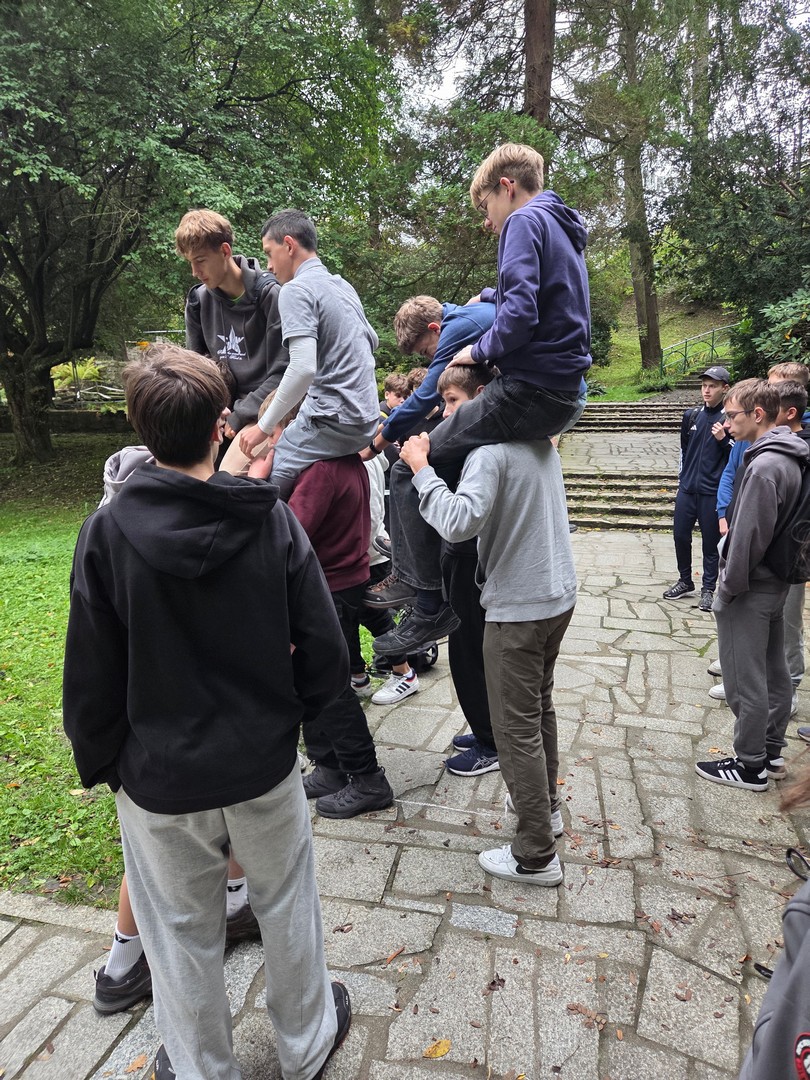 Drugi dzień rozpoczął się od spotkania z Dyrektorem Szkoły, który podkreślił wartość integracji i relacji między uczniami. Każda klasa przekazała na jego ręce przygotowany dzień wcześniej Kodeks Wartości. Jednym z najbardziej wyczekiwanych momentów było losowanie nagród, w tym prawdziwych rarytasów – piłki z autografem Łukasza Piszczka oraz piłki i zdjęć z podpisem Kuby Błaszczykowskiego. Emocji nie brakowało również podczas finałów sportowych, w których najlepsza okazała się klasa 1A, zwyciężając we wszystkich konkurencjach. Po obiedzie odbyła się niezwykła gra terenowa, która dostarczyła mnóstwo wrażeń. Uczniowie musieli zmierzyć się z różnorodnymi zadaniami – zagadkami logicznymi, łamigłówkami, zadaniami zręcznościowymi i wymagającymi spostrzegawczości, a także z próbami współpracy i kreatywności. Drużyny klasowe zbierały punkty, ale najważniejsza okazała się współpraca i dobra zabawa. Podczas gry terenowej uczniowie spotkali niezwykłą Osobę – pana Grzegorza Tomaszewskiego, jednego z więźniów obozu koncentracyjnego Auschwitz-Birkenau. W 1945 roku, mając zaledwie siedem lat, przeżył wojnę i wyzwolenie, stając się jednym z ostatnich żyjących świadków tamtych tragicznych wydarzeń. To spotkanie okazało się niezwykle cenną lekcją historii, której młodzież długo nie zapomni. Wieczorem odbył się pogodny wieczór – czas na planszówki, boisko i ping-pong.