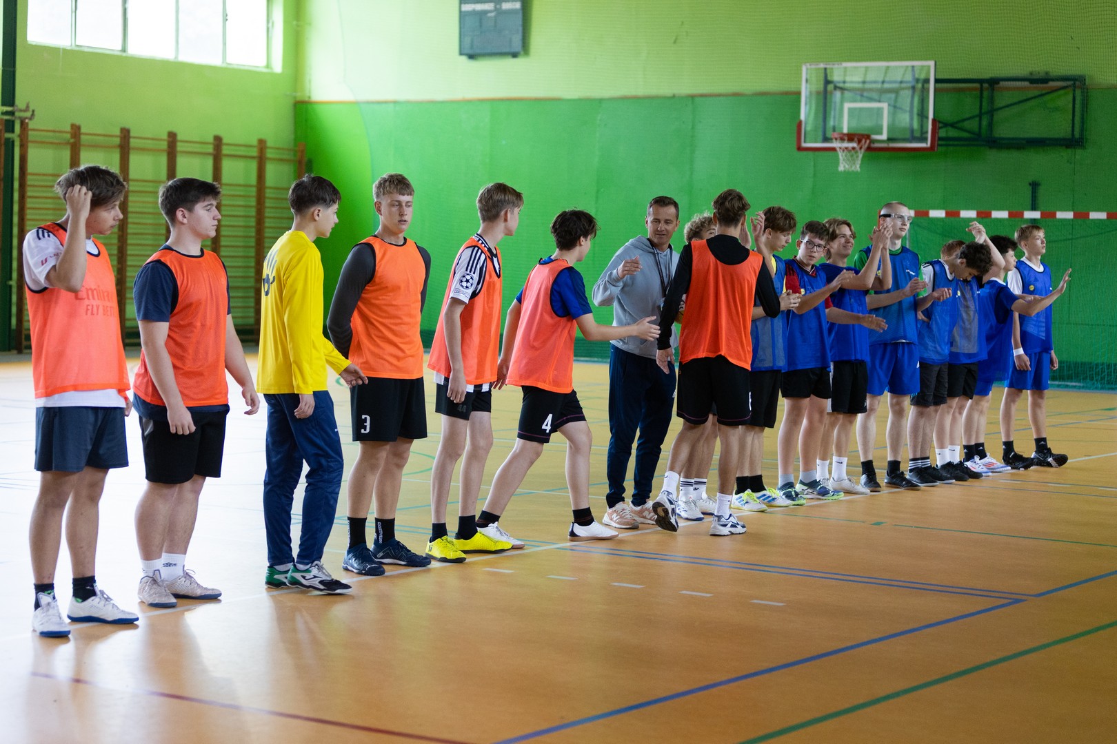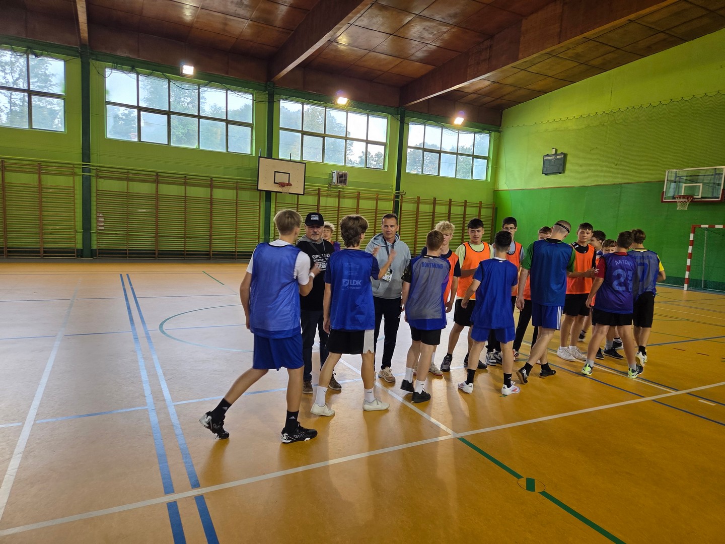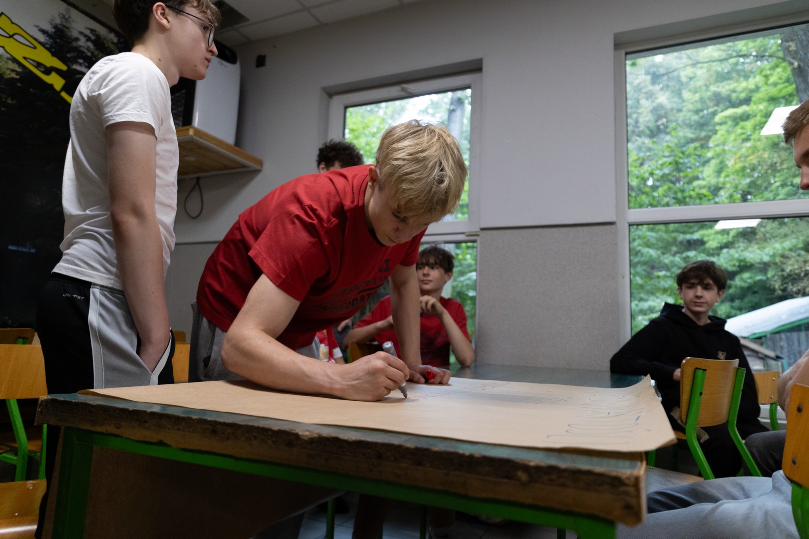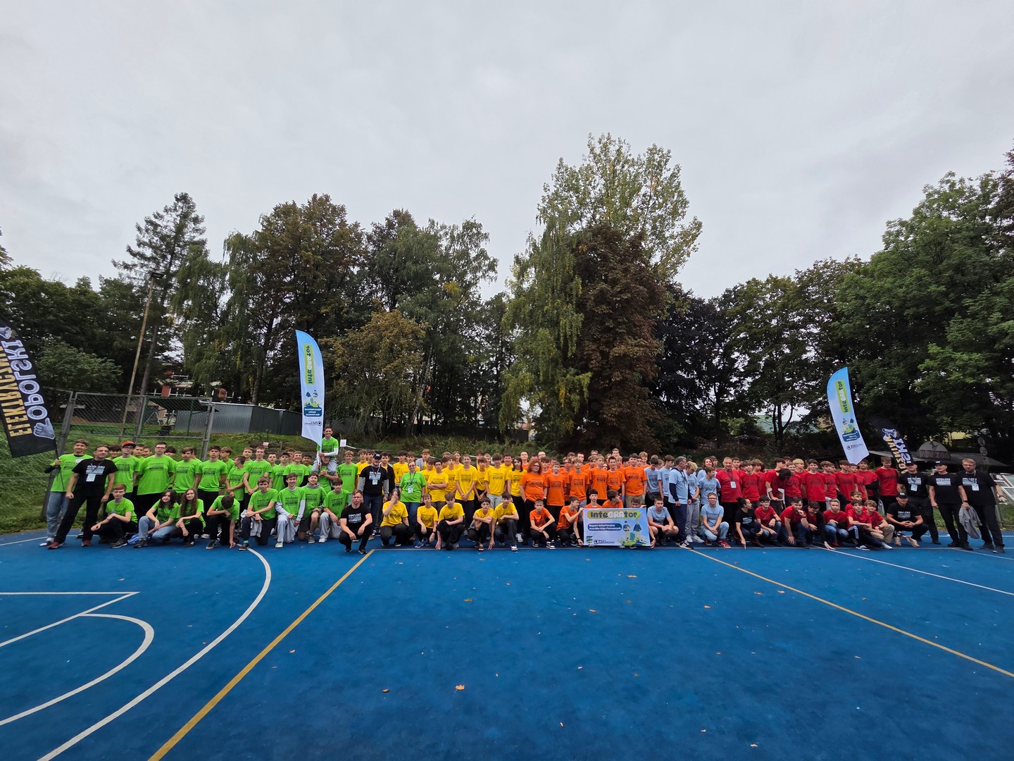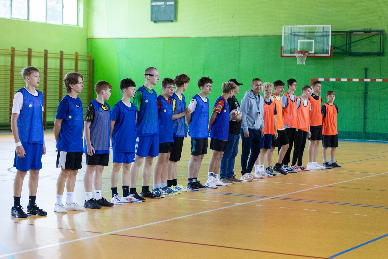 Zaraz po przyjeździe na uczniów czekało pierwsze zadanie integracyjne – związane z poznawaniem siebie nawzajem i swoich imion. Każdy uczestnik otrzymał identyfikator, a także pamiątkowy zestaw: koszulkę z logiem Integratora oraz worek sportowy. To był świetny początek wspólnej przygody, który od razu wprowadził atmosferę współpracy i otwartości. Na uczniów czekały także turnieje sportowe w siatkówkę, koszykówkę, piłkę nożną i szachy. Dawno nie było tak wyrównanych rozgrywek – poziom rywalizacji okazał się naprawdę wysoki, a emocje towarzyszące meczom były zupełnie prawdziwe. Dużym zainteresowaniem cieszyły się również warsztaty pierwszej pomocy przeprowadzone przez szkolną grupę ratowniczą. Po obiedzie przyszedł czas na sesję zdjęciową – uczniowie w nowych koszulkach stworzyli kolorową, pełną energii ekipę. Następnie wspólnie z wychowawcami przygotowali Kodeksy Deklaracji Wartości, które będą im towarzyszyć w kolejnych latach nauki. Wieczór zakończył się przy ognisku – w atmosferze rozmów, śmiechu i budowania relacji.