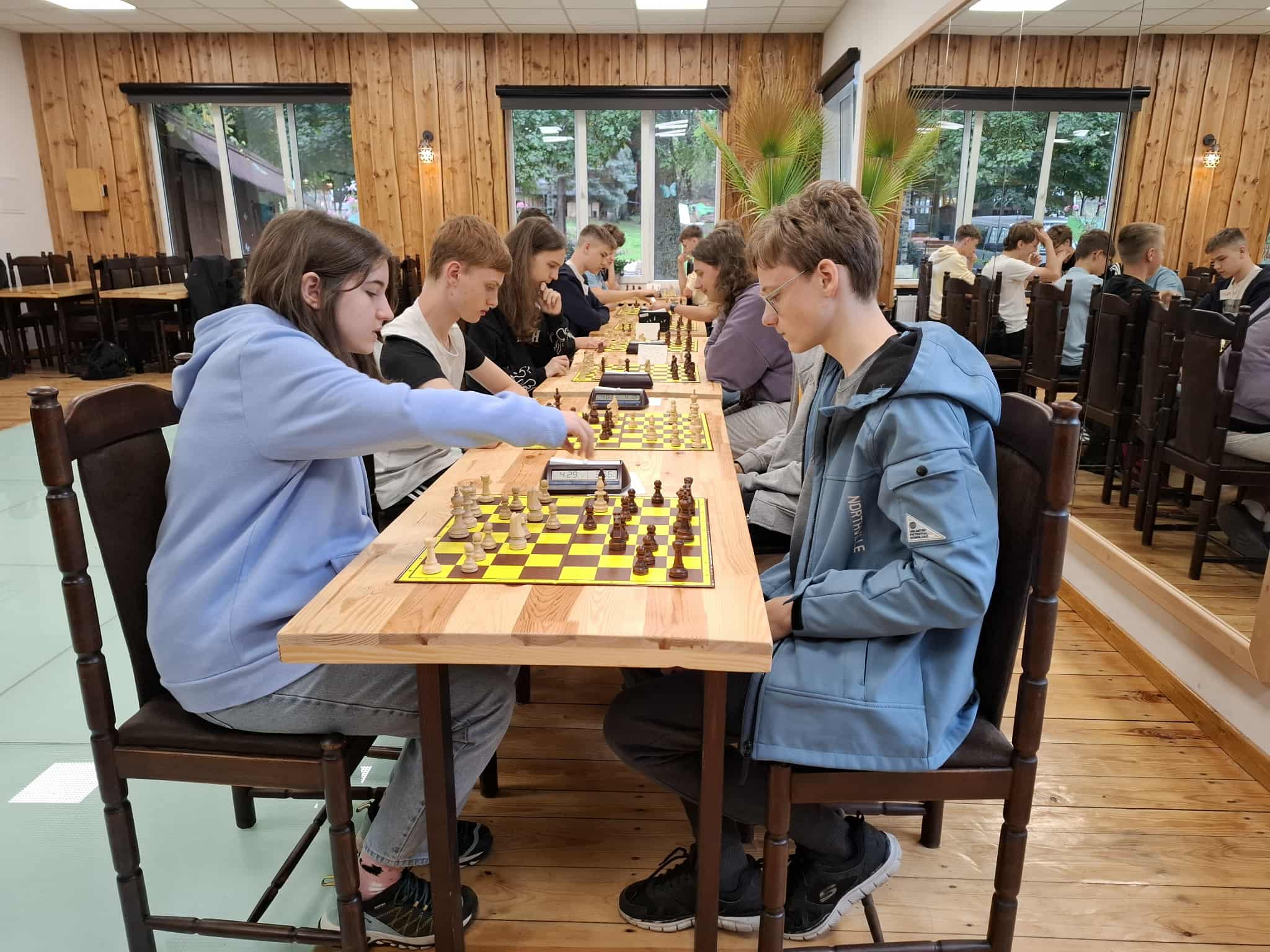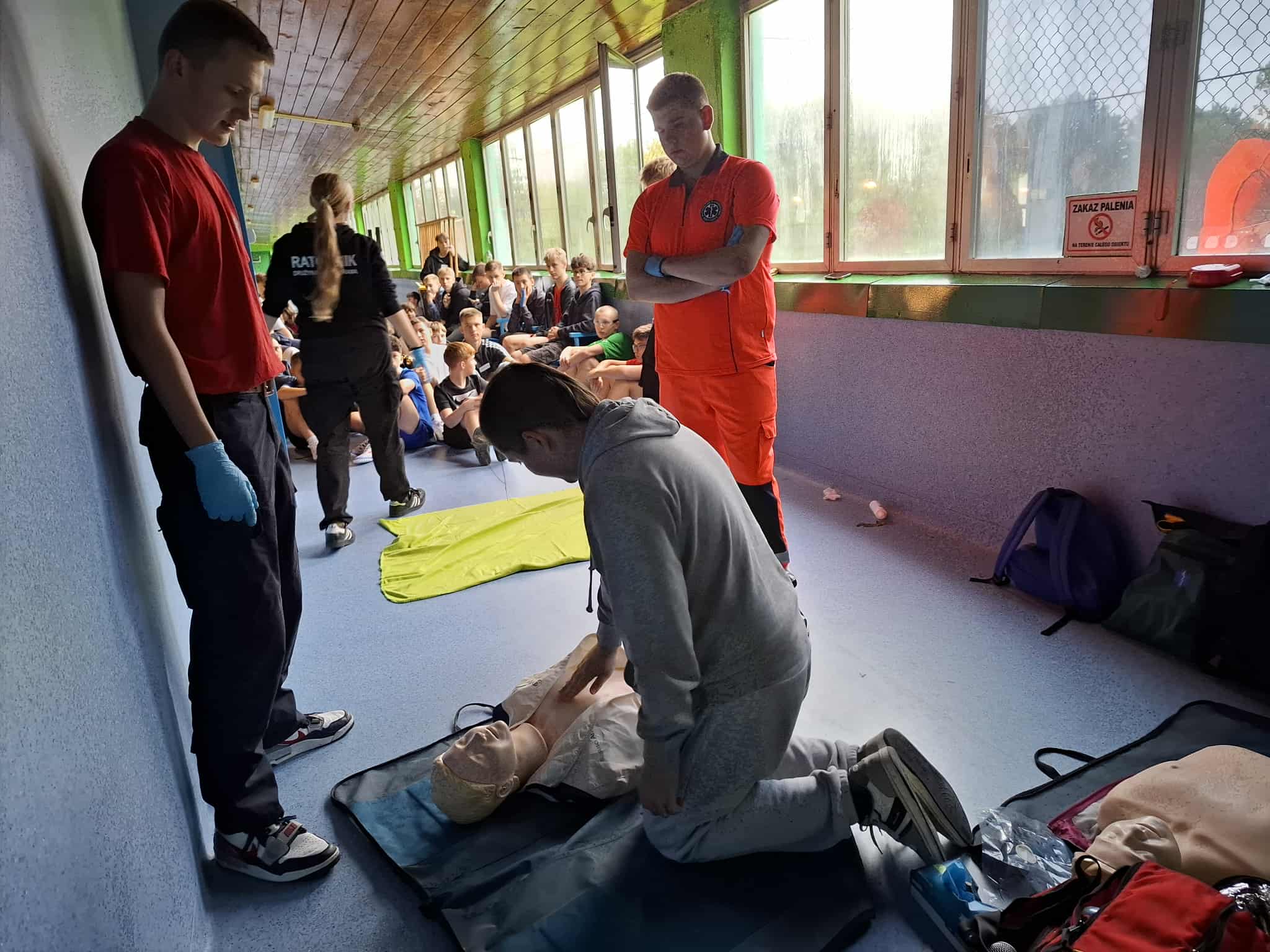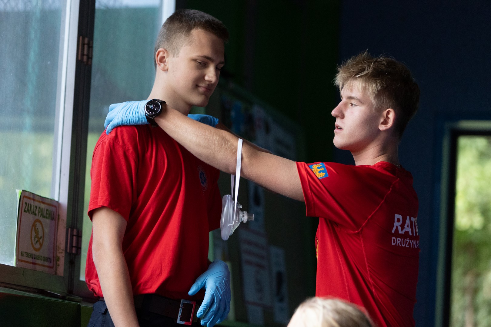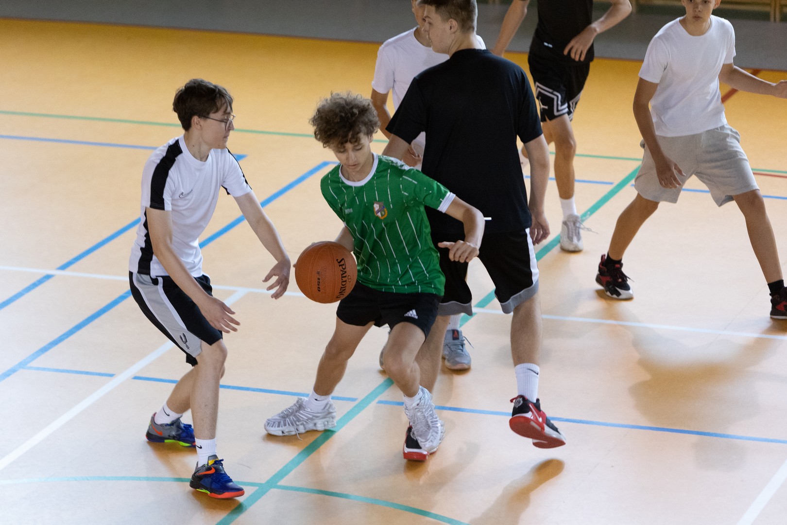 Zaraz po przyjeździe na uczniów czekało pierwsze zadanie integracyjne – związane z poznawaniem siebie nawzajem i swoich imion. Każdy uczestnik otrzymał identyfikator, a także pamiątkowy zestaw: koszulkę z logiem Integratora oraz worek sportowy. To był świetny początek wspólnej przygody, który od razu wprowadził atmosferę współpracy i otwartości. Na uczniów czekały także turnieje sportowe w siatkówkę, koszykówkę, piłkę nożną i szachy. Dawno nie było tak wyrównanych rozgrywek – poziom rywalizacji okazał się naprawdę wysoki, a emocje towarzyszące meczom były zupełnie prawdziwe. Dużym zainteresowaniem cieszyły się również warsztaty pierwszej pomocy przeprowadzone przez szkolną grupę ratowniczą. Po obiedzie przyszedł czas na sesję zdjęciową – uczniowie w nowych koszulkach stworzyli kolorową, pełną energii ekipę. Następnie wspólnie z wychowawcami przygotowali Kodeksy Deklaracji Wartości, które będą im towarzyszyć w kolejnych latach nauki. Wieczór zakończył się przy ognisku – w atmosferze rozmów, śmiechu i budowania relacji.