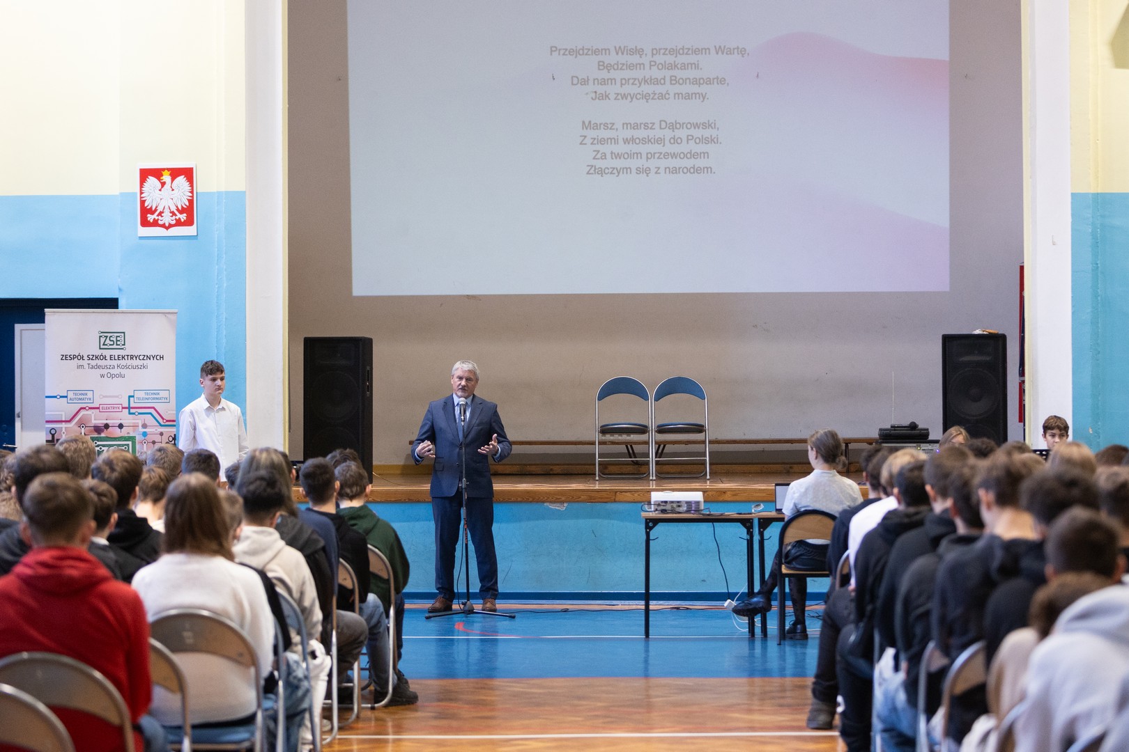 Uroczystość ta rozpoczęła się od wzięcia udziału w akcji “Szkoła do hymnu” i wspólnego odśpiewania Hymnu Polski, w akompaniamencie szkolnej Orkiestry Dętej. Następnie mieliśmy okazję wysłuchać przemówienia Pana Dyrektora Dariusza Dobrowolskiego, w którym przybliżył on historyczne aspekty odzyskania niepodległości przez Polskę oraz wspomniał co ta data oznacza w innych krajach. Kolejnym punktem apelu był koncert Orkiestry Dętej, która zagrała kilka radosnych utworów ze swojego repertuaru. Ostatnim elementem uroczystości była część teatralna. Składały się prezentacja etiudy teatralnej w wykonaniu uczniów klasy 2ct, recytacja wiersza Cypriana Kamila Norwida “Mój psalm” oraz przedstawienie kilku wzruszających cytatów uczniów Elektryka na temat niepodległości.