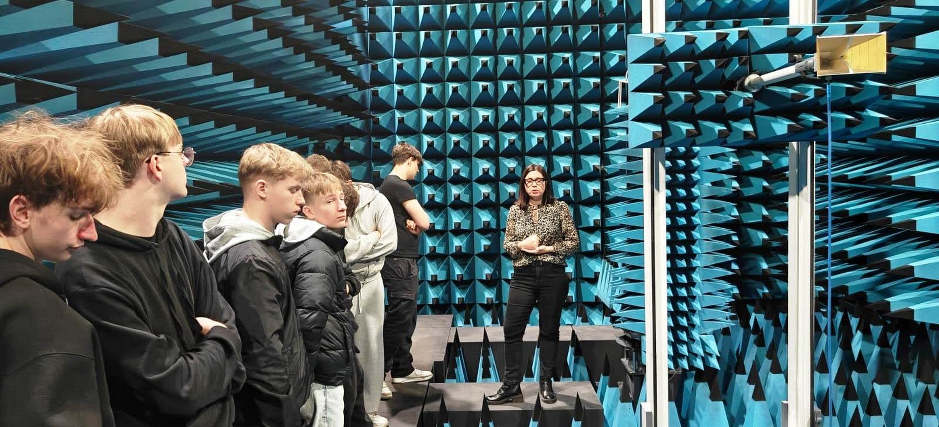 Dzięki uprzejmości Pani Karoliny Spalt - Kierownika Laboratorium Aparatury Pomiarowej EMC, uczniowie podzieleni na grupy ośmioosobowe mogli zapoznać się z nowoczesnym sprzętem oraz poznać
