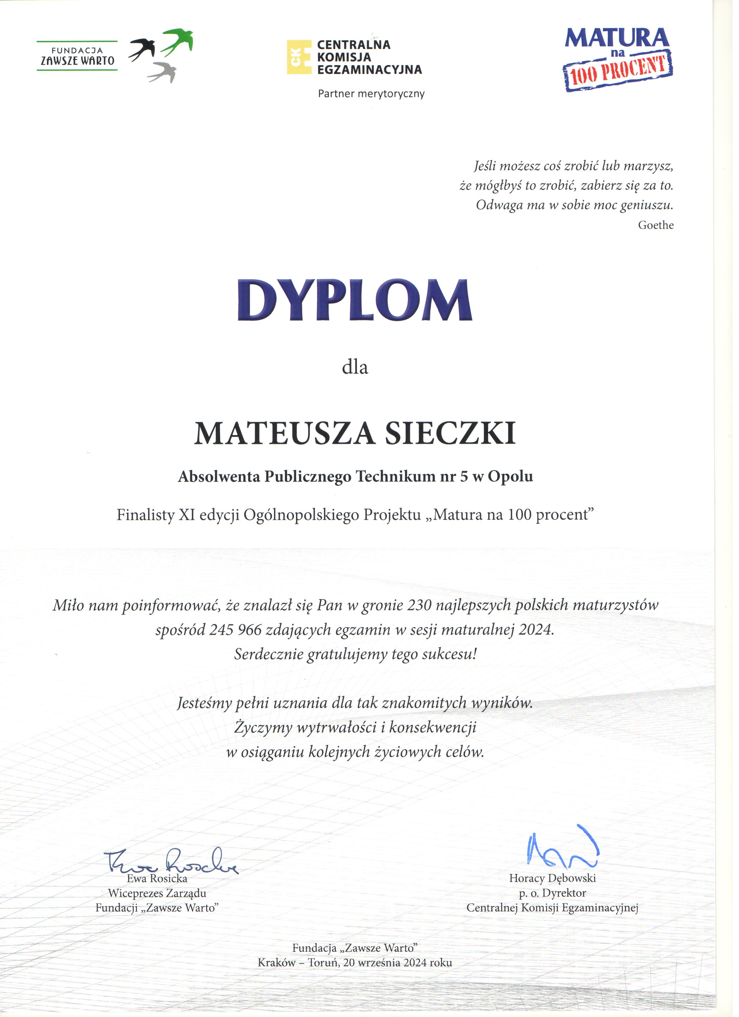 Z ogromną dumą przyjęliśmy wiadomość, że nasz absolwent – Mateusz Sieczka – znalazł się wśród 230 najlepszych maturzystów spośród 24 5966 zdających egzamin maturalny w roku szkolnym 2023/2024 i otrzymał tytuł Finalisty XI edycji Ogólnopolskiego Projektu „Matura na 100%”.